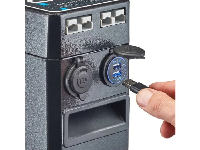 Les batteries LC-Slim disposent de 2 connexions Anderson de 12 volts de 50 A chacune, ainsi que de 2 connexions USB et d’une connexion d’alimentation intĂ©grĂ©e de 12 volts.