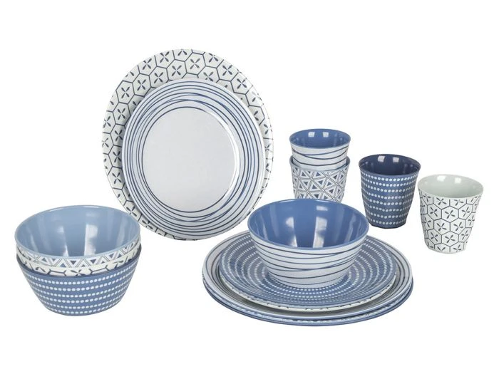 Le service vaisselle se compose de 4 assiettes à dessert, 4 assiettes plates, 4 bols et 4 tasses avec anses, tous assortis les uns aux autres. Ils sont fabriqués en 100 % mélamine, ce qui rend le lot pratiquement incassable et très léger.