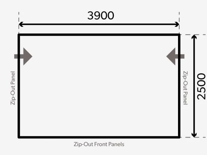 L’auvent a une profondeur de 250 cm et une une longueur de 390 cm. Si vous voulez accrocher cet auvent dans le rail de votre caravane, vous avez besoin d’un rail droit d’au moins 390 cm. Si vous souhaiter accrocher cet auvent dans le rail d’un store, il devrait donc mesurer au moins 400 cm de long.