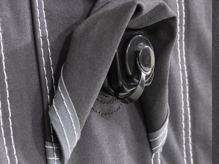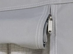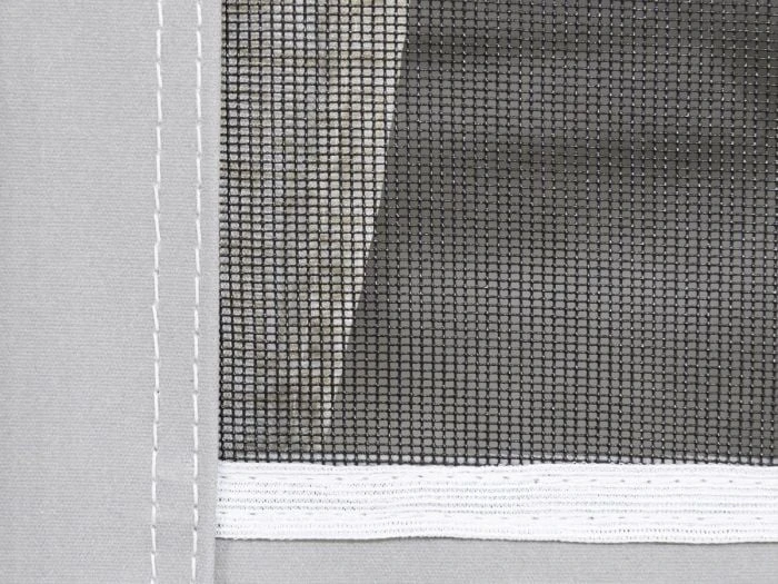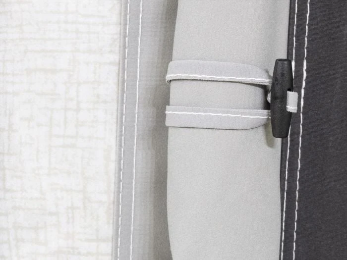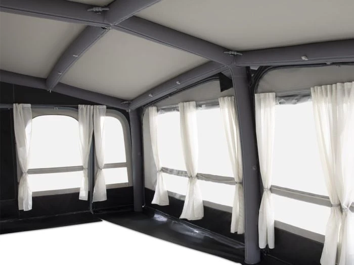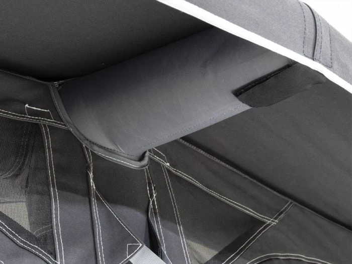 Toutes les parois latérales sont entièrement amovibles, de sorte que vous pouvez également utiliser l’auvent Residence AIR comme une grande solette lors des chaudes journées d’été. Pour une ventilation supplémentaire, les deux portes latérales sont équipées de moustiquaires et il y a des ouvertures de ventilation dans le faîte sous la casquette et en haut dans les coins gauche et droit du côté de la caravane. Les grandes fenêtres qui apportent beaucoup de luminosité peuvent être recouvertes à l’intérieur avec les rideaux fournis. Toutes les fenêtres sont équipées d’un rabat robuste à l’extérieur, permettant de créer plus d’intimité et de protéger le film des fenêtres pendant les périodes où vous n’êtes pas présent au camping.