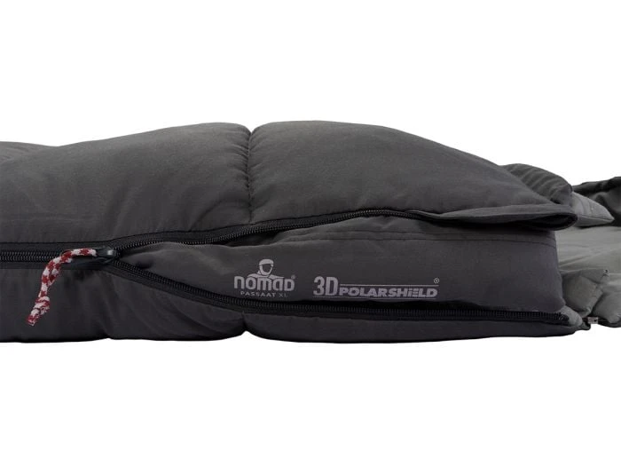 Le sac de couchage est fabriqué en polycoton léger à l’extérieur et en coton doux à l’intérieur. Le sac de couchage est hydrofuge de manière écologique grâce à un traitement sans PFC. Le Passaat XL est doté d’une capuche amovible avec un cordon de serrage qui peut être fixé aussi bien du côté automne que du côté été. En outre, ce sac de couchage est doté d’une fermeture éclair pratique à double sens, avec deux curseurs permettant d’ouvrir la fermeture éclair à la fois par le haut et par le bas. C’est utile si, par exemple, vous souhaitez ouvrir le sac de couchage uniquement en bas pour aérer vos pieds. La fermeture éclair pouvant être ouverte entièrement, vous pouvez également utiliser le sac de couchage comme couverture ou le zipper à un autre sac de couchage Nomad Passaat XL pour créer un double sac de couchage. La fermeture éclair est équipée d’un coupe-vent rembourré afin de ne perdre aucune chaleur corporelle par la fermeture.