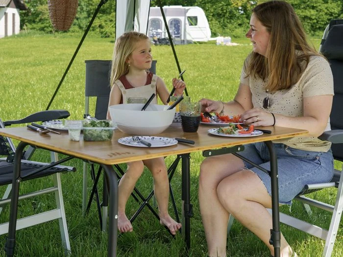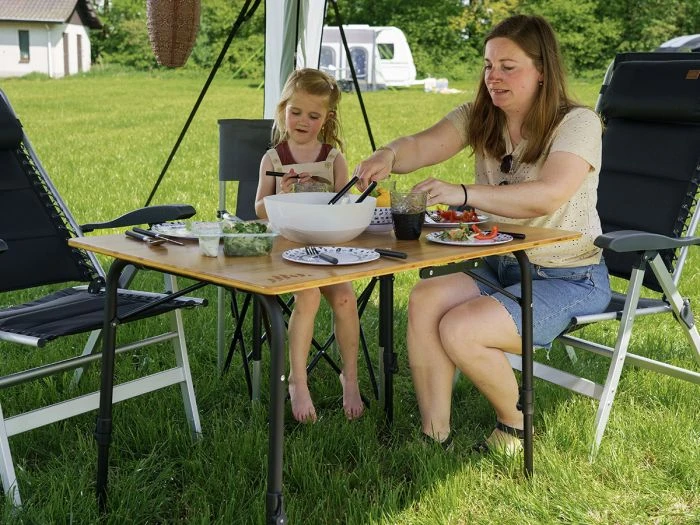 Vous souhaitez aménager votre emplacement de camping avec goût ? Choisissez alors des meubles camping en bambou, comme cette table pliante Obelink. La Bamboo Light 100 a un plateau en bambou et un magnifique cadre noir. La table mesure 100 x 70 cm et est réglable en hauteur de 51 à 70 cm. Les pieds sont équipés d’un système de réglage qui permet d’installer la table de manière droite, même sur des surfaces inégales.