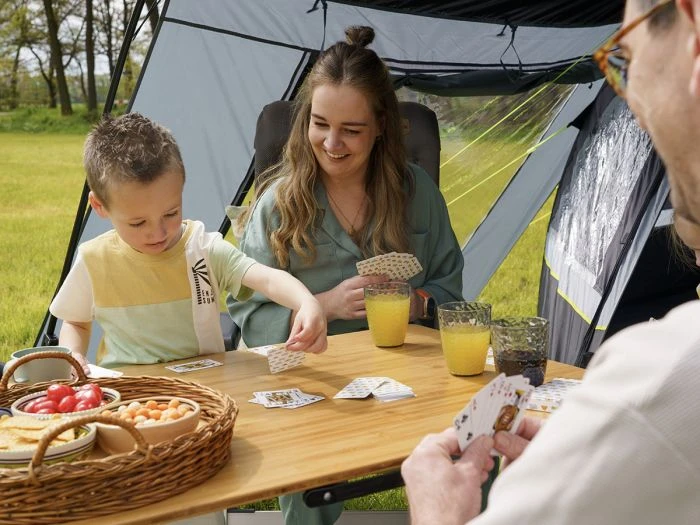 Le cadre est en aluminium léger et le plateau en bambou peut résister à une averse inattendue. La table est pourvue d’une poignée qui vous permet de la porter facilement.