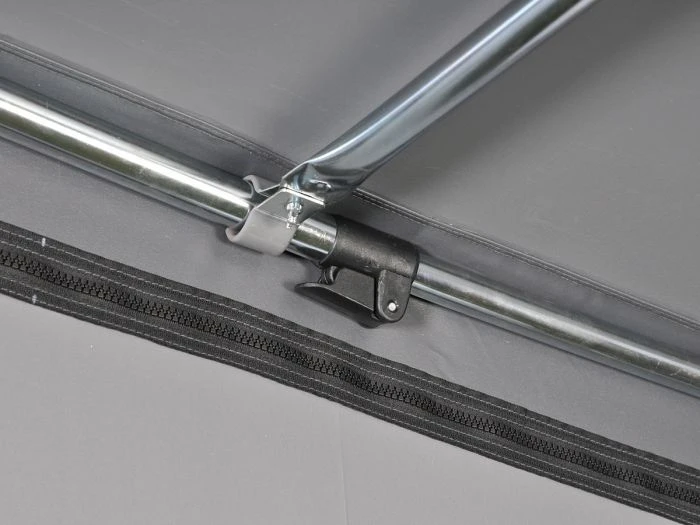 Le Capri 240 est fourni avec un cadre en acier qui peut ĂŞtre rĂ©glĂ© en continu en longueur, en largeur et en hauteur grâce Ă des pinces rapides. Avec l’extension Capri (non incluse), vous pouvez augmenter la surface habitable du store, par exemple pour cuisiner ou dormir. L’extension peut ĂŞtre placĂ©e aussi bien Ă gauche qu’Ă droite, permettant de placer deux extensions.