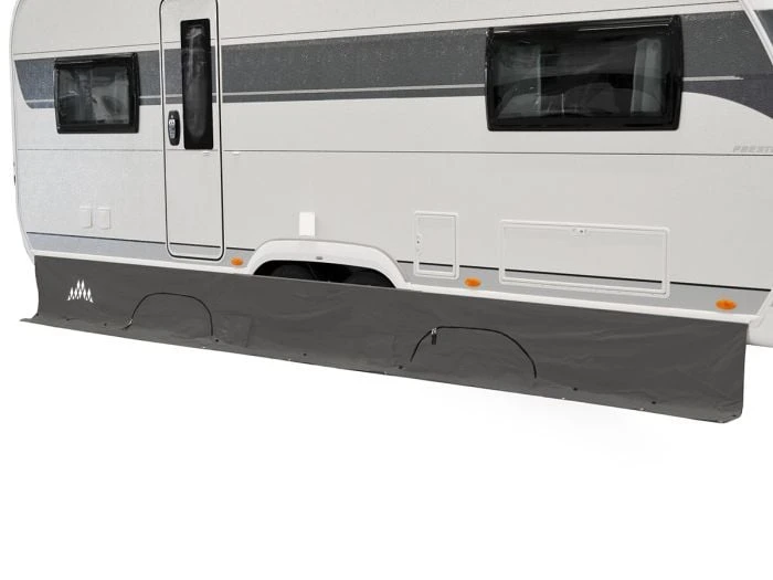 Le jupe convient à toutes les marques courantes de caravanes et fait 600 centimètres de long. Vous n’avez pas cette longueur ? Vous pouvez alors plier la partie en trop. Cela peut aller jusqu’à 400 centimètres, soit la taille de l’extrémité des deux grands compartiments de rangement.