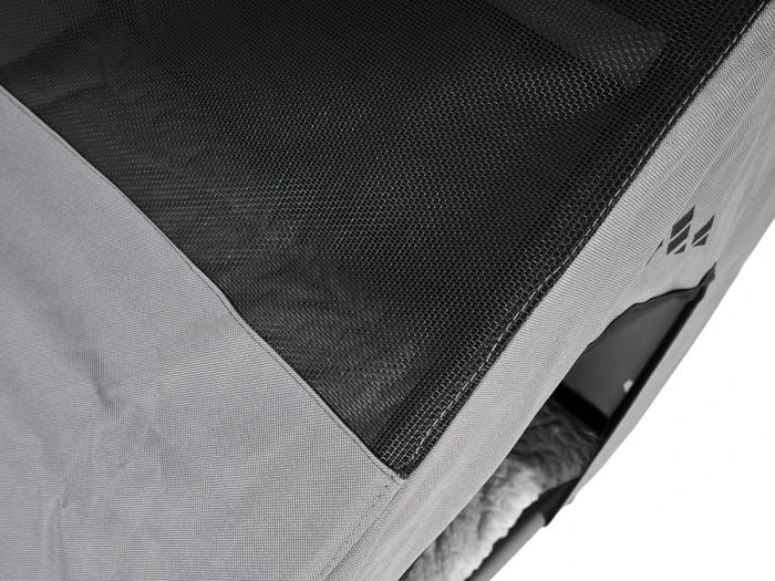 Avec la tente pour chien Dex, votre chien est allongé un peu au-dessus du sol pour ne pas être gêné par le froid ascendant, et il dispose d’un pare-soleil au-dessus de sa tête pour pouvoir se coucher à l’ombre. Pendant les journées chaudes, le toit peut être partiellement ouvert pour laisser entrer un peu plus d’air frais à travers la moustiquaire.