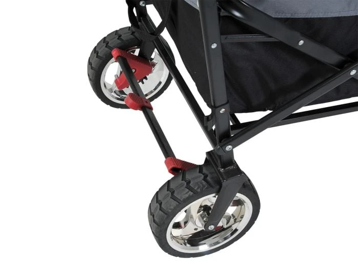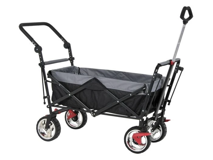 Ce chariot de transport est Ă©quipĂ© d’une barre de traction Ă l’avant et d’une poignĂ©e Ă l’arrière. La barre de traction et la poignĂ©e sont toutes deux rĂ©glables en hauteur. Le guidon peut ĂŞtre rabattu et la barre de traction peut ĂŞtre fixĂ©e avec un clip de sĂ©curitĂ© lorsqu’elle n’est pas utilisĂ©e. Le chariot est Ă©quipĂ© d’un double système de freinage Ă l’avant et Ă l’arrière.
