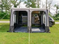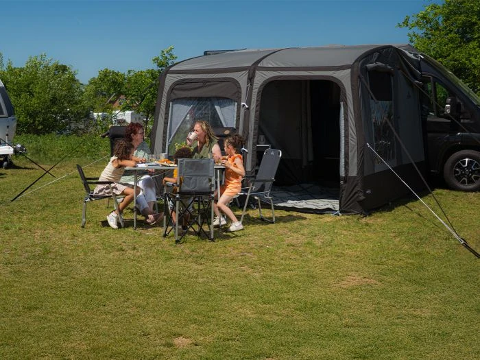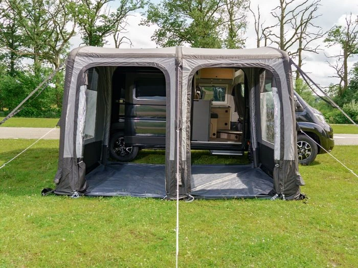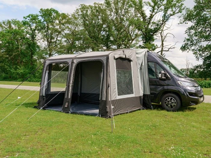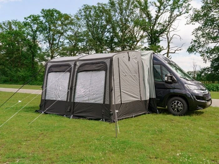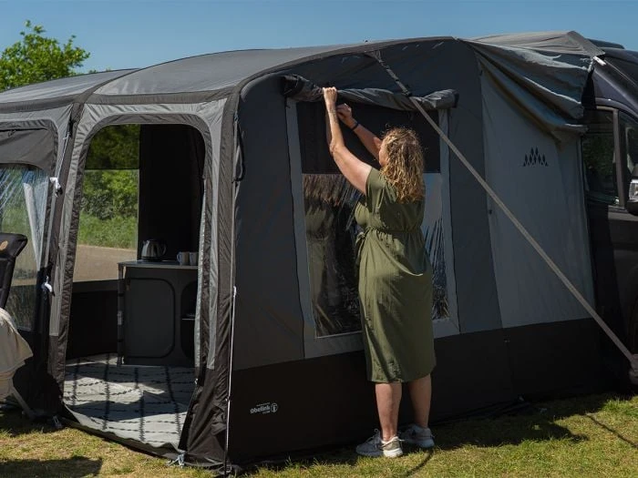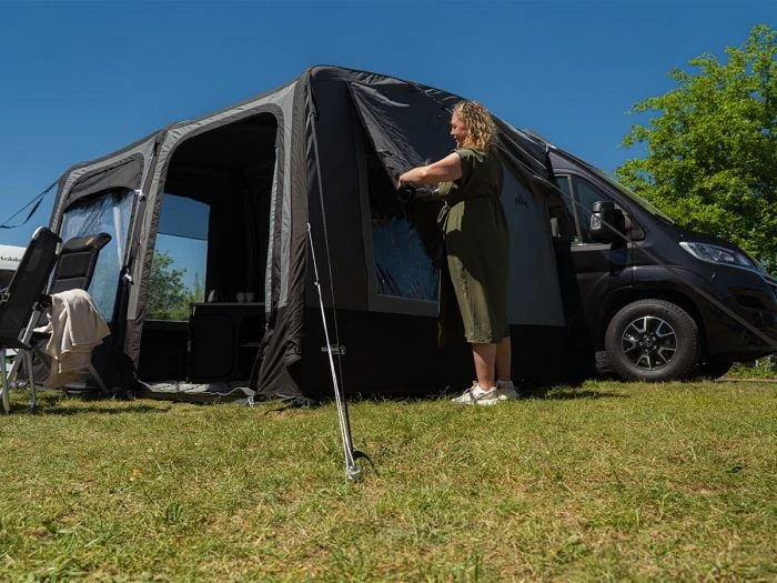 Son système de gonflage pratique vous simplifie la vie : tous les arceaux sont reliés entre eux, il suffit de brancher la pompe sur un seul point pour gonfler toute la structure. De plus, l’auvent ne contient pas de boudins d’air au niveau de la bande de liaison, ce qui le rend parfaitement compatible avec un van aménagé doté d’une porte latérale coulissante.