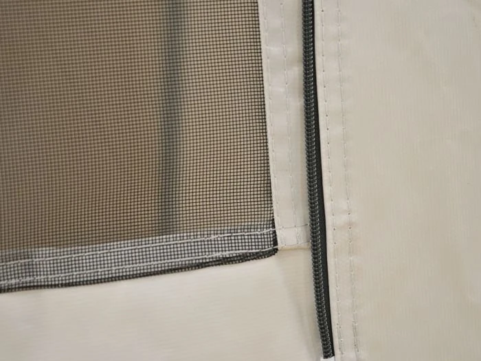 La grande porte ronde à l’avant est équipée de deux curseurs de fermeture éclair pour plus de commodité. La porte peut être enroulée à moitié ou complètement vers la droite. Vous avez également la possibilité de rabattre le seuil afin de ne pas trébucher. Vous souhaitez complètement fermer la tente ? Vous pouvez alors zipper le seuil à la porte sur toute sa longueur.