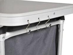 Vous aimez préparer de bons plats au camping ? Alors la Obelink Tricias Luxe est la cuisine de camping idéale pour vous. La Tricias est composée de 3 plans de travail, dont celui du milieu est destiné pour votre réchaud afin d’avoir un plan de travail des deux côtés. Les deux compartiments de rangement aux extrémités sont pourvus d’une étagère et peuvent facilement être fermés. À l’arrière de ces deux compartiments se trouve une partie en mesh de ventilation. L’étagère du milieu est idéale pour par exemple votre jerrican. Un côté est équipé de trois crochets de suspension pratiques, très pratique pour accrocher votre torchon ou essuie-mains par exemple.