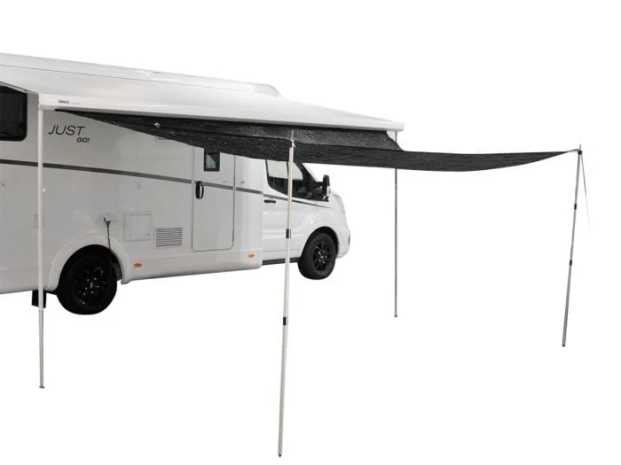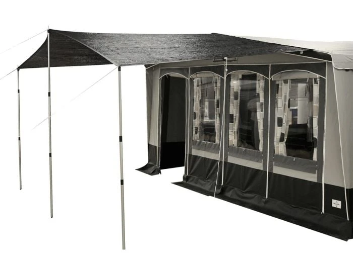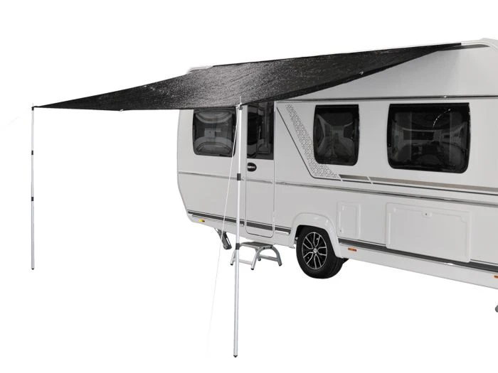 La toile d’ombrage peut ĂŞtre utilisĂ©e de diffĂ©rentes manières. Elle est Ă©quipĂ©e de joncs de 5 mm et 7 mm. Tu peux l’utiliser directement dans le rail de la caravane avec le jonc de 7 mm ou la faire glisser dans le rail de ton store Ă sac ou cassette avec le jonc de 5 mm. Il est Ă©galement possible de la fixer Ă une tente d’auvent Ă l’aide de bandes de raccordement (vendues sĂ©parĂ©ment).