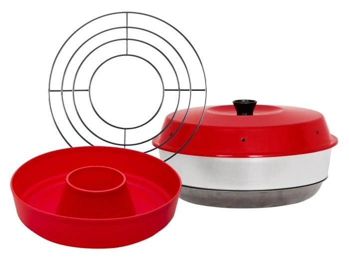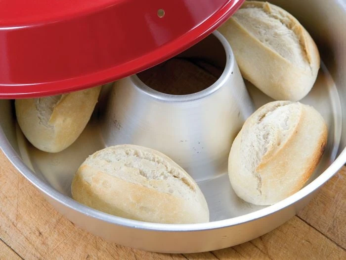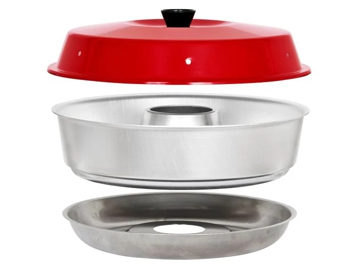 Le four est composé de 3 pièces, une base en acier inoxydable, un moule en aluminium et un couvercle rouge en aluminium avec des petites ouvertures de ventilation. Ces pièces sont toujours utilisées ensemble et fournissent une chaleur inférieure et supérieure, comme avec un four normal. L’Omnia peut être utilisé sur toutes sortes de plaques de cuisson, à l’exception d’une plaque de cuisson induction.