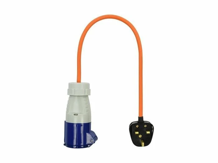 La prise est de couleur bleue, blanche et orange. Elle a un courant de 16A et une tension de 230V. Elle est dotée de 3 broches et d’un indice de protection IP44. Montage au moyen de colliers à vis. De plus, l’adaptateur a une longueur de 40 cm.
