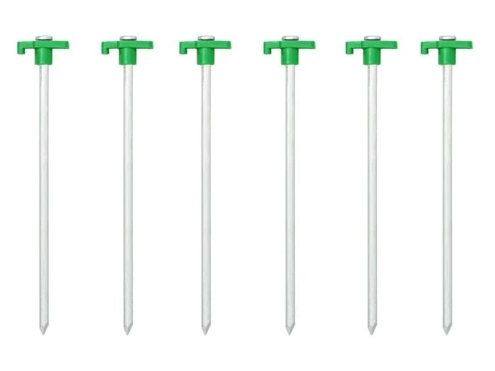 Ce lot se compose de 6 piquets clous carrés avec crochets en matière synthétique Pro Plus d’une longueur de 25 cm. Grâce à la tête de clou ronde, vous pouvez facilement enfoncer ces sardines dans le sol. Le crochet en matière synthétique permet de maintenir fermement en place un élastique de tente ou une corde.