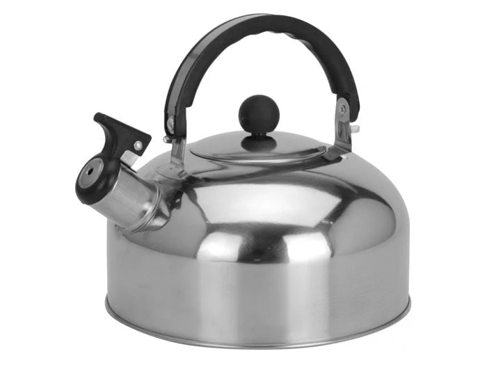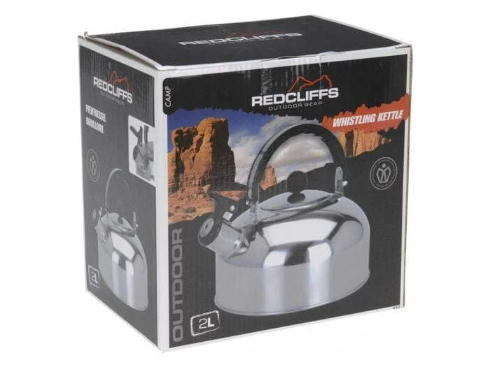 La bouilloire sifflante Redcliffs en acier inoxydable 2 litres est légère et pratique pour le camping.