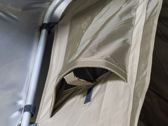 La sĂ©rie Jimba Jimba est Ă©quipĂ©e tout autour de grands panneaux de maille ventilĂ©e qui peuvent ĂŞtre entièrement couverts de l’intĂ©rieur. Ainsi, par beau temps, tu peux profiter pleinement de l’environnement et, en cas de mauvais temps ou si tu souhaites plus d’intimitĂ©, tu peux fermer complètement la tente.