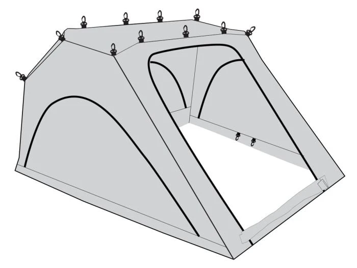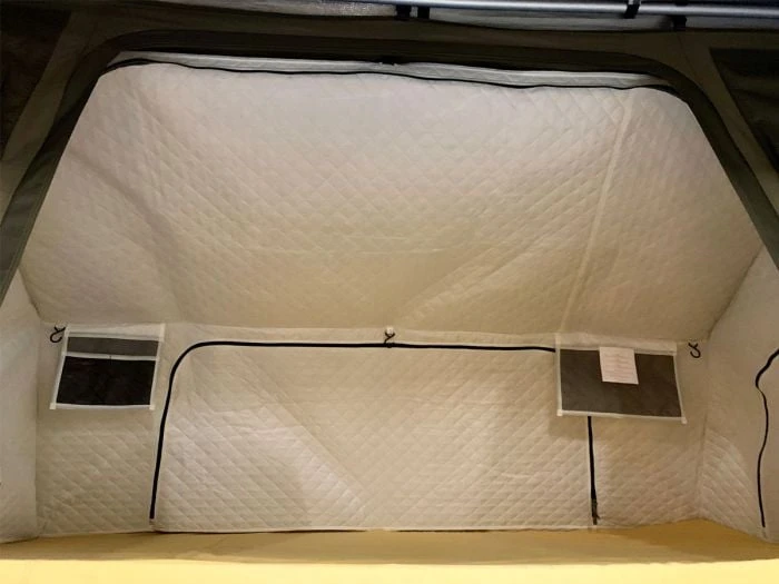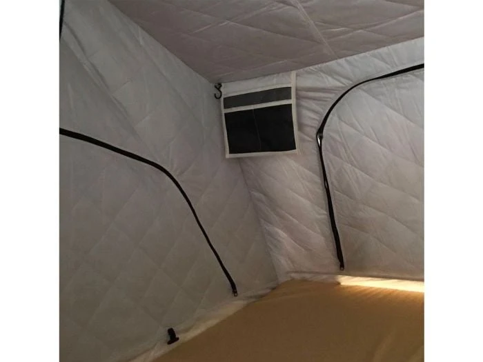 La tente intĂ©rieure thermique se fixe Ă l’intĂ©rieur de la tente de toit avec du velcro et peut rester en place mĂŞme lorsque la tente est repliĂ©e.