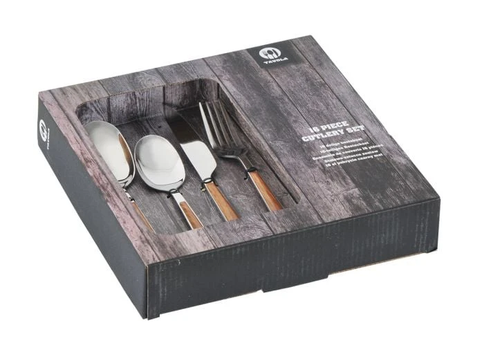 L’ensemble de couverts Tavola houtlook de 16 pièces est dotĂ© de poignĂ©es en plastique Ă effet bois.