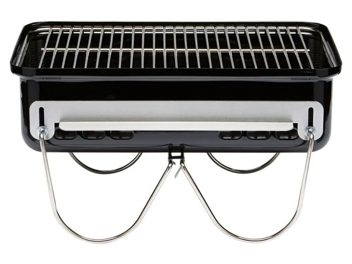 Le barbecue repose sur des pieds rotatifs, que vous pouvez tourner autour du couvercle pour le ranger. Cela permet de verrouiller le couvercle pour le transport. Le Go-Anywhere est en porcelaine émaillée et équipé d’une grille en acier.