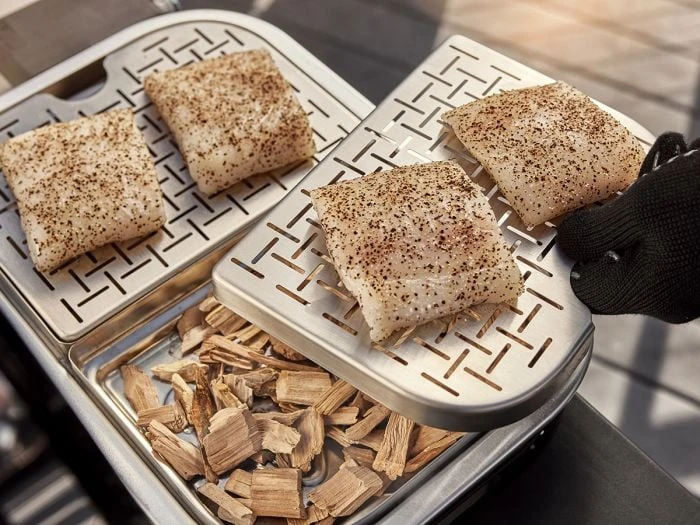 Fumer : Avec le set d’accessoires, vous pouvez également fumer ! Utilisez des copeaux de fumage secs ou humides avec le réglage d’infusion de fumée sur le barbecue, pour préparer les meilleurs plats fumés.